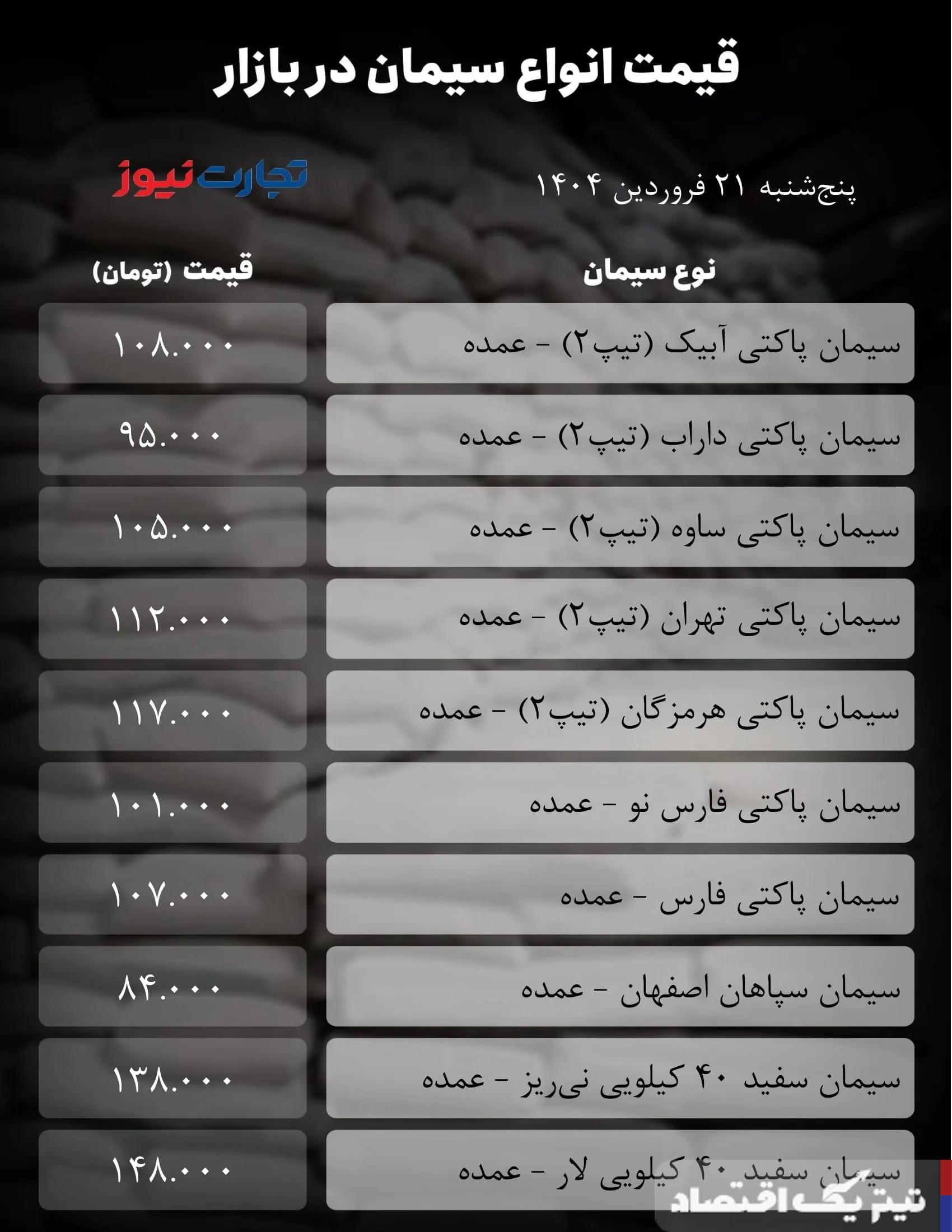در ادامه بهای انواع سیمان را در جدول زیر مشاهده کنید.